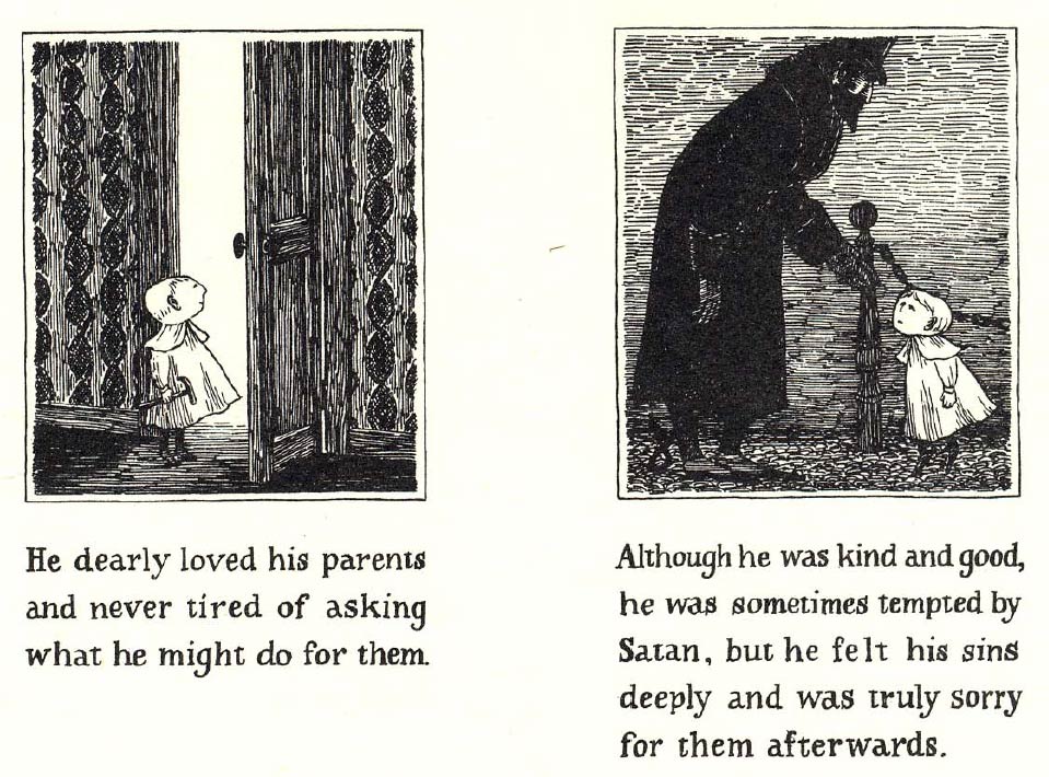 Gorey has also been accused of being a child hater. In several of his books infants either die gruesome deaths or, like in 'Beastly Baby' (1962), are depicted as a cruel, unlikeable monstrous being. In reality, he never expressed any negative feelings towards children. People who knew him personally described him as somebody who didn't mind the presence of children, and vice versa. He was also fond of animals, owning various cats and letting a bunch of raccoons nestle in his attic.