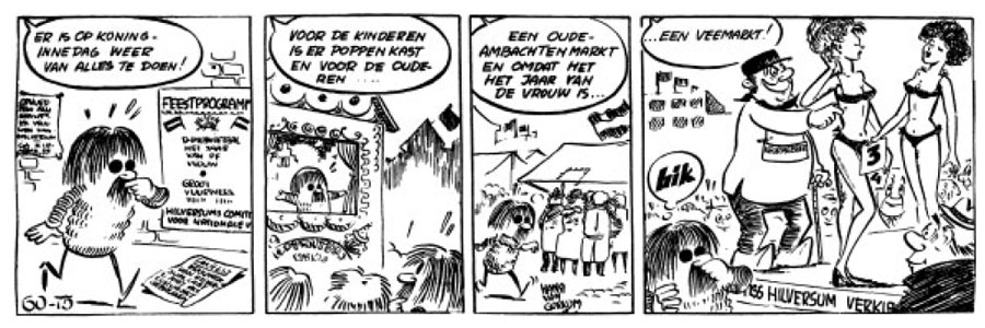 Despite his discharge and his ongoing health issues, Van Gorkom remained involved in Hilversum's social and cultural work through associations with the local youth holiday work program, the scouts and Unicef. Between 1973 and 1981, he was the illustrator and cartoonist of HIK (Hilversumse Informatie en Kommunikatie), an independent weekly, appearing on two pages in the local newspaper Gooi- en Eembode. While the supplement was initially launched as a way for the municipality to communicate more directly with civilians, HIK also invited readers to send in their own articles and comment on social issues.