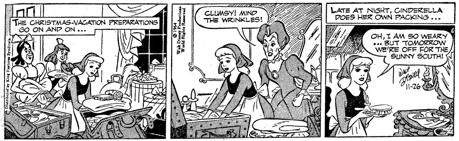 In addition to his work on the 'Mickey Mouse' strip, Floyd Gottfredson did the lay-outs for a story called 'Chesty and Coptie', appearing in a 1945 Chestie giveaway book published by the Los Angeles Community Chest. The finished art on this war-time charity promotion was done by Bob Grant. He also contributed to the 'Treasury of Classic Tales' Sunday page by drawing the comic adaptation of Jack Hannah's Disney short 'Lambert, the Sheepish Lion' (written by Frank Reilly, 1956). In March and April of 1958, Gottfredson wrote the Sunday newspaper story 'The Seven Dwarfs and the Witch-Queen', which served as a sequel to the 'Snow White' movie, with artwork by Julius Svendsen. From August to December of that year, Gottfredson and Svendsen also made an adaptation of 'Sleeping Beauty'. Gottfredson returned to the 'Treasury' feature once more in 1961 by doing lay-outs for the adaptation of '101 Dalmatians' for penciler Chuck Fuson. In addition, he did artwork on Frank Reilly's special Christmas stories with the movie characters 'Cinderella' (1964) and 'Bambi' (art in collaboration with Guillermo Cardoso, 1965).