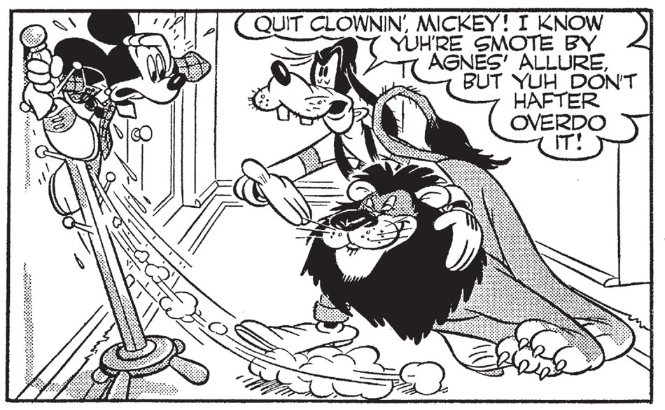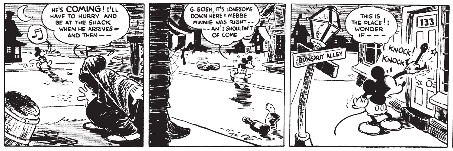 On 17 May 1930, Gottfredson was brought in to continue the feature, both for writing and art duties. What started as a fill-in job for just two months, resulted in a 45-year tenure. His presumed replacement Jack King lasted only two weeks on the strip, from 9 June to 21 June 1930. In the end, Gottfredson turned out to be the artist Disney was looking for. Someone equally skilled in writing as well as drawing, and also more enthusiastic about continuing a daily newspaper comic. While he thought up the plots of his stories himself, from 1934 on, he left the definitive scriptwork to other Disney staff writers. These included Ted Osborne (1934-1949), Merrill De Maris (1934-1942), Dick Shaw (1942-1943) and Bill Walsh (1943-1955). For the artwork, Gottfredson received help from the inkers Hardie Gramatky (1930), Roy Nelson (1930), Earl Duvall (1930-1931), Al Taliaferro (1931-1932, 1936-1937), Ted Thwaites (1932-1940), Bill Wright (1938-1943, 1946-1947) and Dick Moores (1943-1946), until he started inking the strips himself in 1947.
