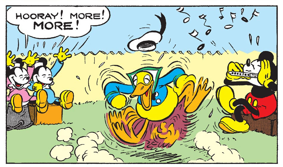 Mickey Mouse Sunday comic of 31 March 1935 with the appearance of Donald Duck (colored yellow at the time). © Disney