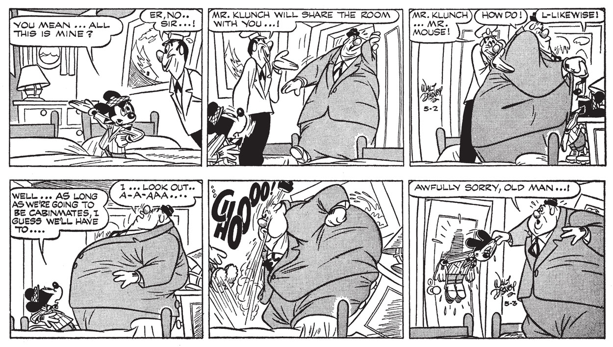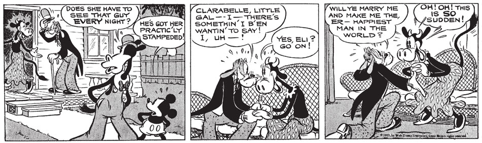 Besides innovative storylines, Gottfredson also enriched Mickey Mouse's universe by creating many new cast members, exclusively for the comics. In the 1930 'Death Valley' storyline, the corrupt notary Sylvester Shyster had been introduced by Walt Disney early on, but Gottfredson made him even more vicious, and continued to use the character in later narratives. Second in line was Butch, a dog-faced thug who made his debut in 'Mr. Slicker and the Egg Robbers' (1930), but later followed his conscience and became a "good" character, even one of Mickey's best friends. Still, he was retired after a few adventures and rarely used for decades. Another notable villain created by Floyd Gottfredson is Eli Squinch, introduced in 'Bobo the Elephant' (1934), a con man and regular accomplice of Pete, who at one point proposes to Clarabelle Cow to get his hands on her inheritance.