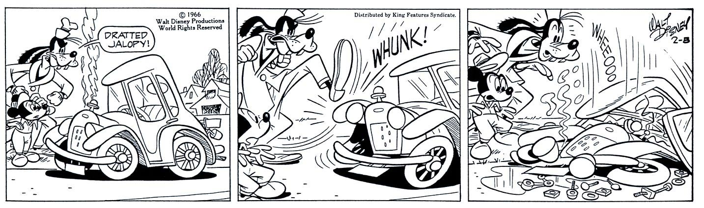 By 1955, the same year the Disneyland theme park opened, Mickey lost much of his heroic persona. The comic became a more suburban gag-a-day feature, with gags written by Bill Walsh (1955-1962), Roy Williams (1962-1968) and Del Connell (1968-1975).