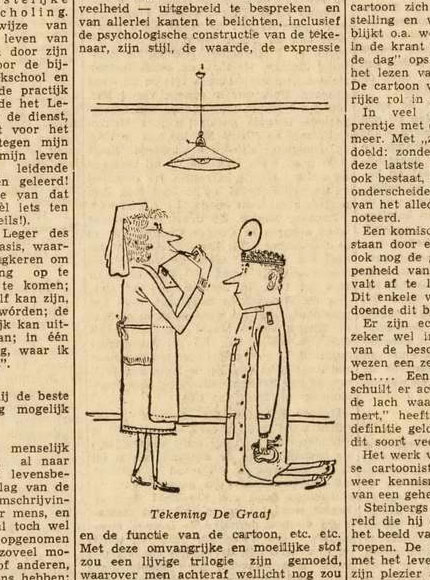 Almost nothing is known about the cartoonist who signed his work with De Graaf. During the 1950s, he was a regular gag cartoonist for Het Vaderland, a newspaper published in The Hague. Besides cartoons, De Graaf also wrote articles about his profession and cartoon art in general. While his first name was not mentioned in those articles, the cartoonist did reveal in a 1 April 1957 article that he lived in a house by the sea and that he was a professional cartoonist.