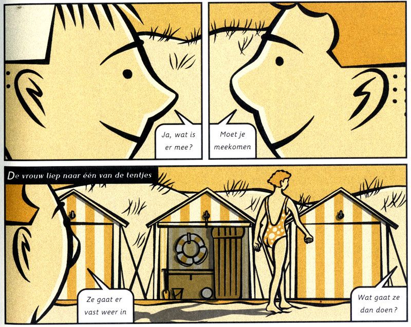 While suffering from a burn-out, De Graaf started making comic stories about his childhood memories in his spare time. These were published in the graphic novels 'Verbleekte Herinneringen' (2003), 'Gekleurd Geheugen' (2003) and 'Gevonden Verleden' (2004)' by De Harmonie and Oog & Blik, and eventually collected in 'Verzamelde Herinneringen' in 2005. With his Clear Line-inspired, sober and peaceful drawings, De Graaf focuses the reader on the sentiments that lie in his work.