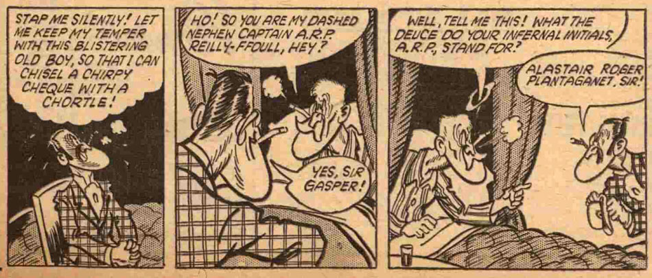 Modeled after early cinematic villains, the Captain gained wide popularity with his eccentric behavior, while the comic's general knack for strange expressions, wordplay and alliterations also caught on. Reilly-Ffoull's exclamation "Stap me!" became a catchphrase among the Royal Air Force during World War II. "Stapme" was for instance the nickname of Battle of Britain pilot and Squadron Leader Basil Gerald Stapleton, who was a big fan of the strip. The air force also decorated some of their Spitfire planes with imagery from Graddon's comic. Another fan of the 'Just Jake' strip was comic historian Denis Gifford, who gave his first book on British newspaper strips the title 'STAP ME! - The British Newspaper Strip' (Shire Publications, 1971). The Daily Mirror released a book collection of the 1945 storyline 'Educating Eric' under the title 'The Sly Snister Scurvy Adventures of Captain Reilly-Ffoull'.