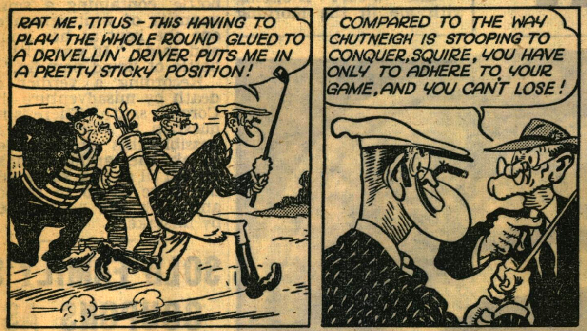 Not much is known about the artist himself. Bernard Joseph A. Graddon was born in 1905 in the Welsh town of Abergavenny, Monmouthshire. By the late 1930s, he was working for the London newspaper The Daily Mirror, launching his signature comic 'Just Jake' on 4 June 1938. Unlike the title suggests, the character of Jake only had a minor role in the strip. After about a year, Graddon's ploughboy hero was sent off to fight for king and country at the call of war, leaving his girlfriend Hazel Nutt behind. The strip's main focus was on Captain A.R.P. Reilly-Ffoull, the villainous squire of Arntwee Hall in the village of Much Cackling in the county of Gertshire. Together with his butler Eric (a "Buttle by Bottle") and his henchman Titus Tallow, the Captain caused havoc among the townspeople, which also include the Nutt family, the elderly Maida Grannitt, schoolgirl Missy, and a black man called Cactus.