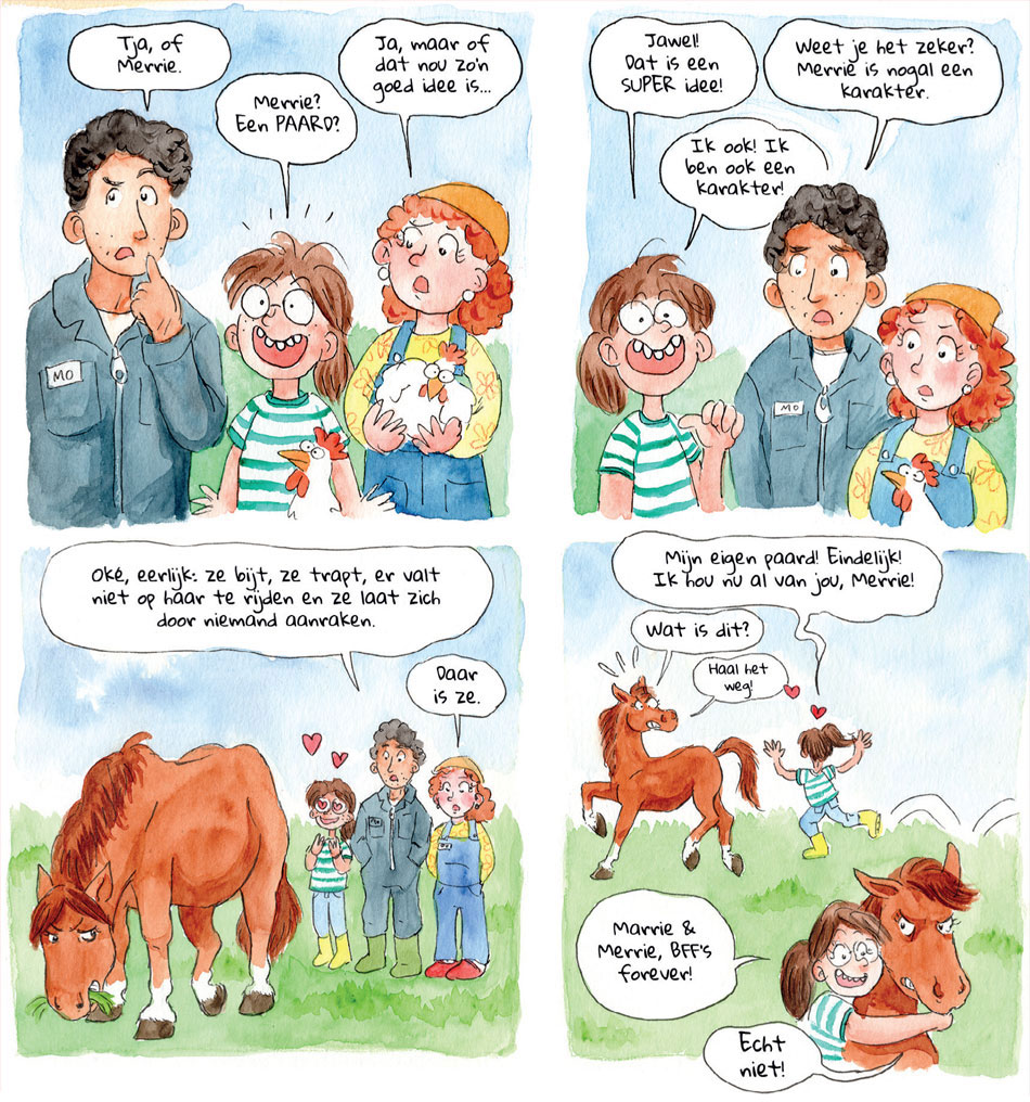 In 2023, Graef and scriptwriter Margreet de Heer additionally launched the fully watercolor-painted comic feature 'Marrie & Merrie', about a horse-obsessed girl and an unwilling horse.