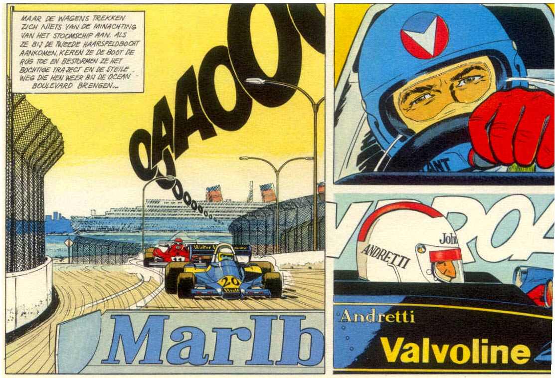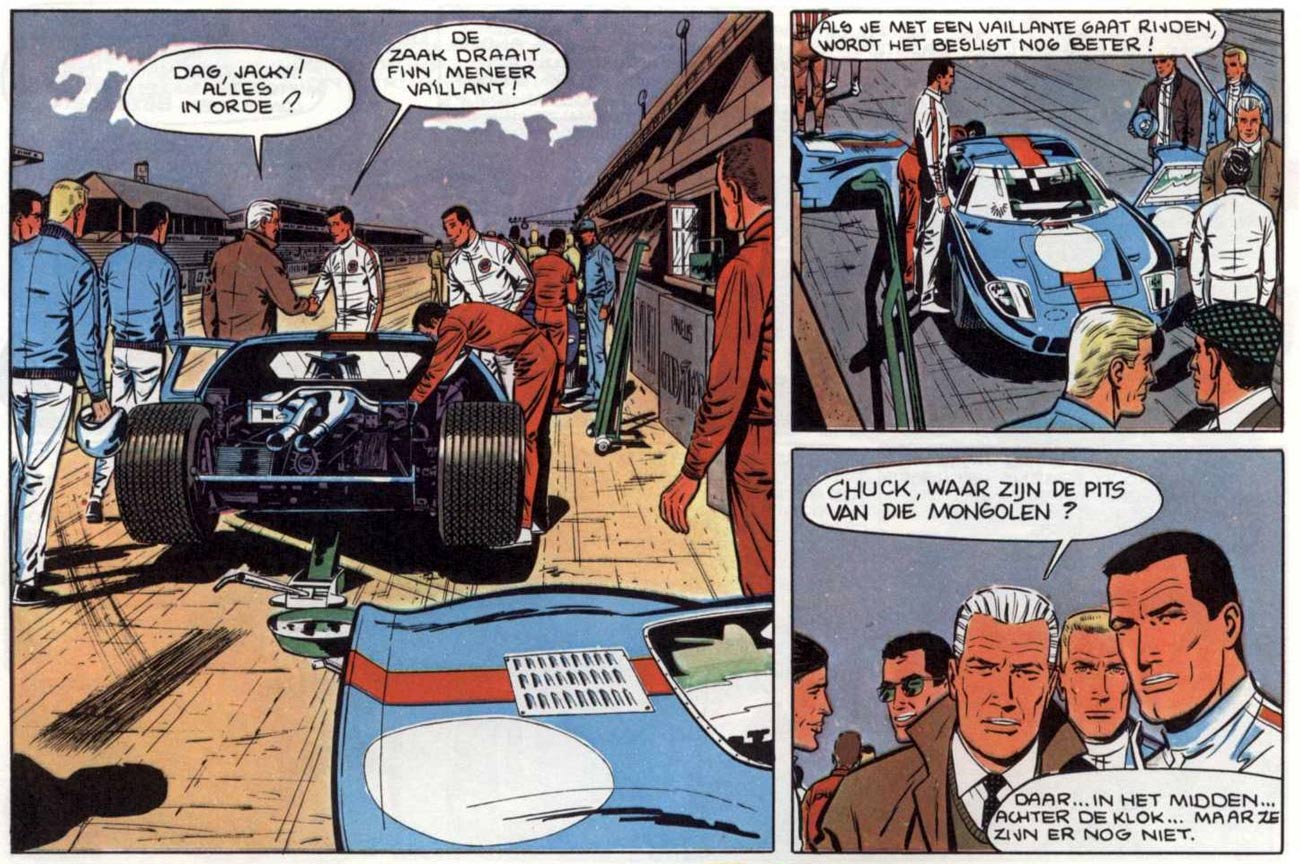 One of Graton's best friends was the Belgian race car champion Jacky Ickx, whom the comic artist knew from his early years at the sports paper Le Journal des Sports. Ickx' father was a journalist and race car driver, who often visited the editorial office with freshly written articles. Jacky was about eight years old at the time, but despite their age gap, he and Graton struck up a lifelong friendship. When, as an adult, Ickx became a professional race driver in the mid-1960s, he often provided Graton with relevant background information about the sport. Around this time, he coincidentally also became one of the greatest champions, making him eligible for a guest role in the 'Michel Vaillant' story 'Le Fantôme des 24 Heures' (1970). After publication, Ickx' father treated Graton to a dinner at a seaside restaurant in De Haan, because he felt this comic book appearance was beneficial for his son's career. As Ickx won more championships throughout the 1970s and 1980s, he had several extra appearances in 'Michel Vaillant'. So much in fact, that he basically became a secondary cast member. In later stories, Ickx' daughter Varina (a racing champion herself) was also a recurring character.