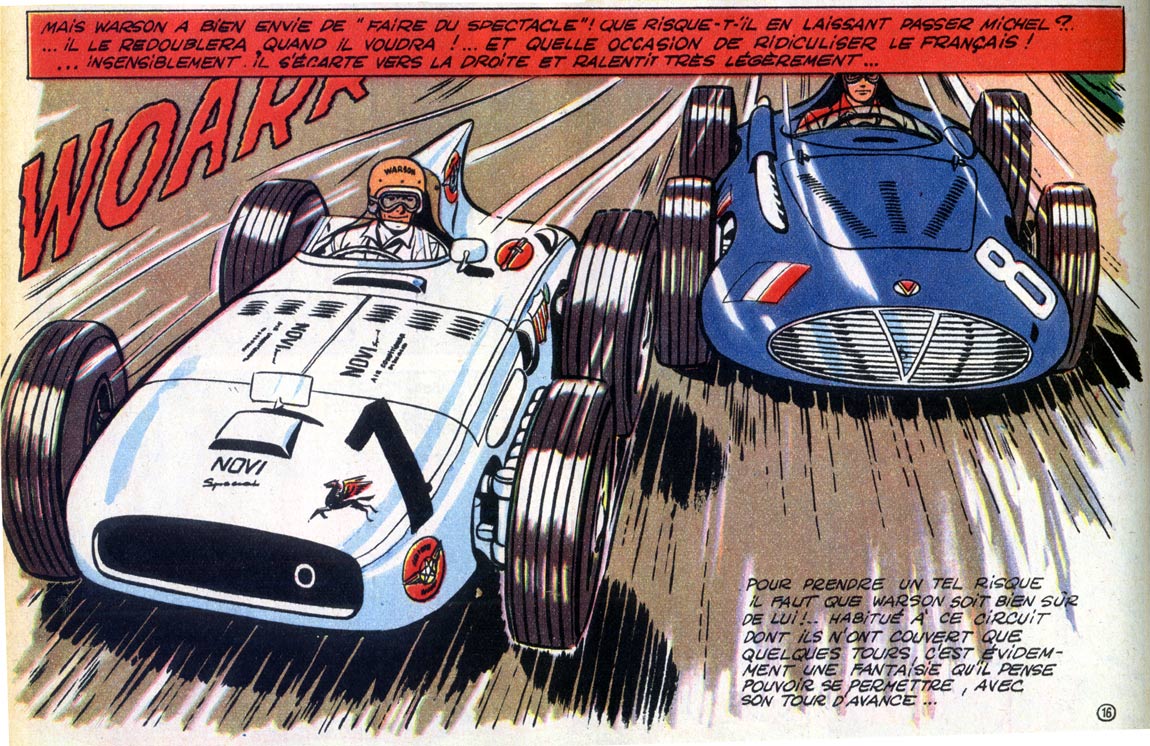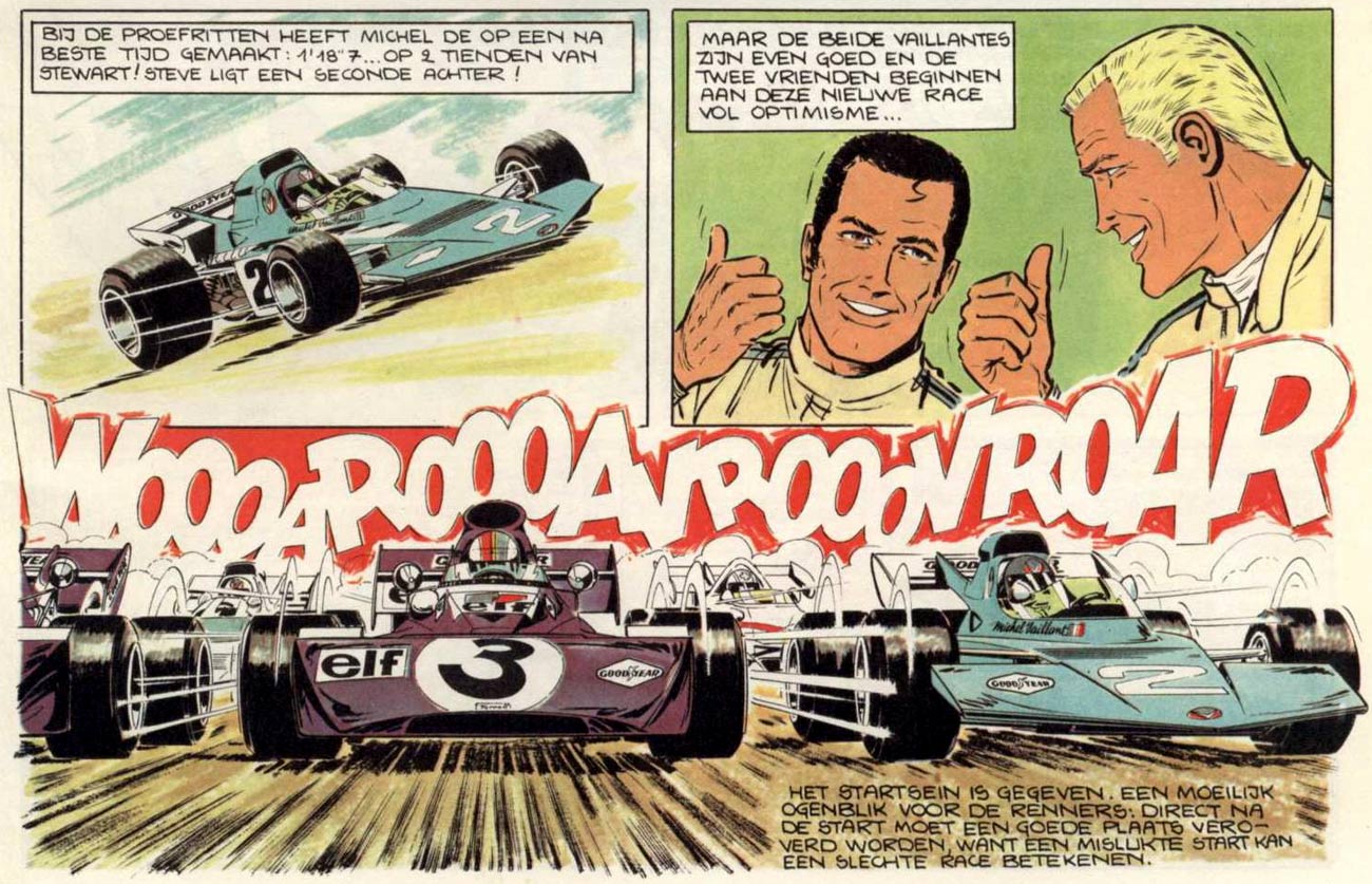 One of the hallmarks of 'Michel Vaillant' is its use of extravagant onomatopoeia to indicate the loud noises made by the speeding vehicles. The sounds often almost leap from the panels, which Graton felt was necessary to suggest movement and velocity. He was inspired by a World War II movie in which a Japanese sharpshooter hid in a tree. While the viewer only saw the lifeless tree, the sound effects implied that he was there, firing his gun. In a following scene the U.S. soldiers fired at him, whereupon the same shot of the tree was shown, with sounds indicating that he dropped his rifle, after which his corpse fell down and viewers finally saw him. Graton was impressed that while the visual image of the tree remained stationary, everything was implied by sounds. He applied this technique to his artwork too.