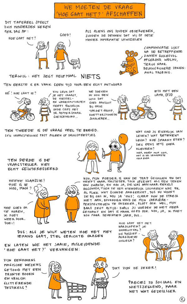 Renske de Greef is a Dutch columnist and artist. Since 2000, she has written columns for magazines and newspapers such as Spunk, De Morgen, nrc.next and MacFan, as well as a couple of novels. She has a weekly comics column called 'Renske Stript' (2015- ) in NRC Handelsblad, tackling everyday observations and irritations.