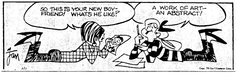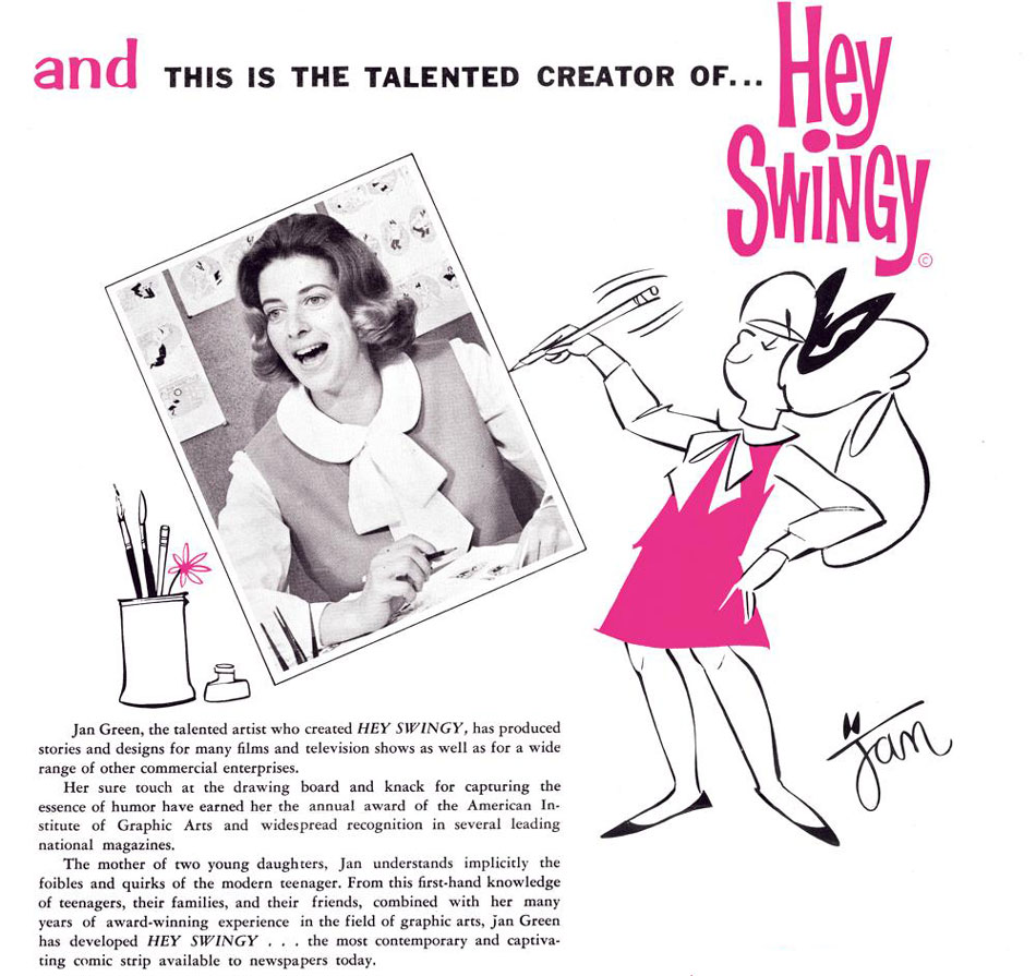 Not much is known about the life of the cartoonist Jan Green. In a press article announcing the publication of her signature comic 'Hey Swingy', she is described as the "mother of two daughters". 'Hey Swingy', her strip about the "zany and laughable antics of a typical teenage girl" was syndicated by General Features from 26 October 1964 until 1970. That year, the American newspaper feature secretly went into reruns. When readers started to complain, the syndicate stated that Green was "ill". 'Hey Swingy' disappeared from circulation shortly afterwards. The Stripper's Guide blog cites 17 April 1971 as the most likely cancellation date. In 1970-1971, the comic strip also ran in French under the title 'Julie' in the Québecian newspaper La Presse.