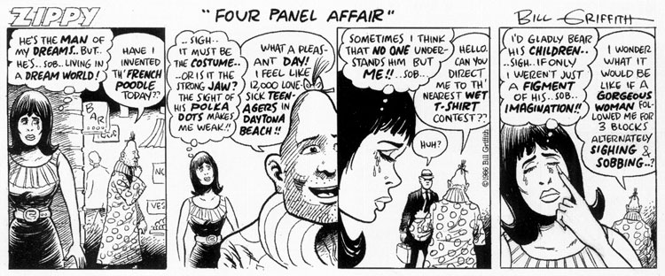 His most famous character is 'Zippy the Pinhead' (as in 'Zippy for President'), the polka-dotted clownsuit-wearing human with a pointy head, who made his first appearance in the first issue of Real Pulp in 1970. Griffith's style was different than that of other underground artists. His comics are satirical and humorous, and don't hesitate to criticize today's media-saturated and celebrity-obsessed society. The strip went weekly in 1976 when it was featured in the Berkeley Barb and was then syndicated nationally through Rip Off Press until the artist turned to self-syndication to college newspapers and alternative weeklies under the Zipsynd (later Pinhead Productions) label in 1980.