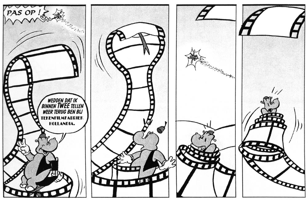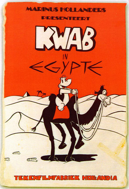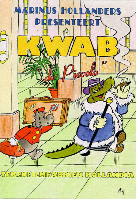 Originating from his creator's passion for classic animation, the hippo Kwab is presented as if he originated from the 1920s. De Groot concocted a backstory about his grandfather "Marinus Hollanders", who animated a couple of shorts with 'Kwab het Cloecke Nijlpaard' through his fictional Haarlem-based animation studio "Teekenfilmfabriek Hollandia". To illustrate his concept, De Groot designed a couple of vintage style film posters for these alleged silent era cartoon films. 'Kwab van het witte doek' (1996) was released through Yellow Paper Publishers, and has the author interact with the rediscovered creation of his grandfather in a mix of photo-comic and classical comic. Comics news magazine Stripschrift at least bought the backstory, as they were glad "readers had the chance to get acquainted with a piece of lost animation history" (Stripschrift #298). Zozolala also praised the artist's "tribute to his grandfather" (Zozolala #92).
