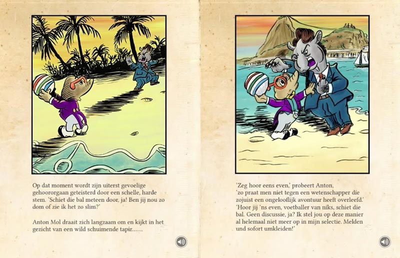 Stefan de Groot is mostly active as a multimedia artist through his own Creative Cave studio in Haarlem. He makes illustrations, animated cartoons, concepts and apps, and designs interactive multimedia experiences for museums. Creative Cave also publishes children's books, picture books and comics for print and interactive eBooks with sound and animation. Among his commercial clients are KLM Airlines, Stiching Kinderpostzegels (children's stamps), VKG Recycle and the local broadcasting company RTV-Noord. By 2003, De Groot had experimented with an interactive webcomic about solar energy called 'Het Zonneschip'. With John Croezen he was responsible for the 2008 animated series based on Dick Bruna's 'Miffy' for broadcasting foundation KRO. From 2010 on, he has specialized in making animated cartoons based on existing children's books illustrations for apps, such as 'Timo en het Toverboek' and 'Timo en het Toverstokje' by Rian Visser and illustrator Klaas Verplancke, as well as 'De Gelukkige Olifant' by comedian Youp van 't Hek. He also teamed up with Paul Rooyackers again to rework their book series 'The Incredible Tales of Prof. Dr Anton Mole' into the interactive audiobook 'Anton Mol en de ontdekking van het eiBoek' (2014), for which De Groot provided both animation and voices. Creative Cave also released the eBook 'Olivier Flap Kleuravontuur' (2014), starring the little elephant created in the 1990s by Dirk Arend.