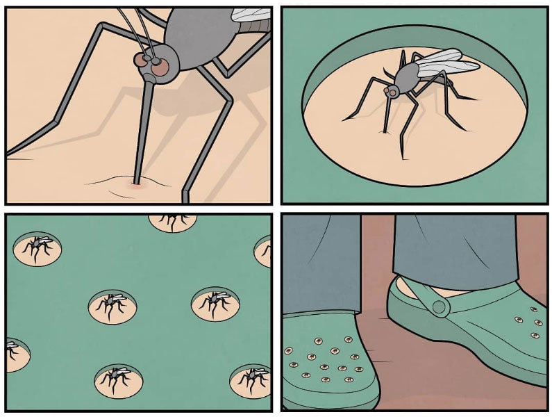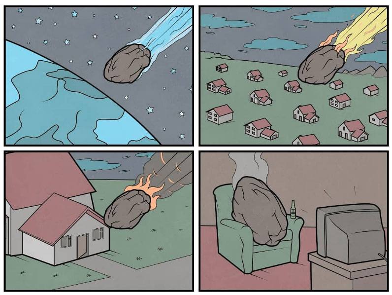 Often, Gudim zooms in or out of a scene to reveal a strange truth. Bowls of dog food, for instance, appear to be the craters, which explains why wolves howl to the moon. In another gag, a boxer seems to be practicing his punches in the air, but after zooming in, it turns out he is actually having a boxing match against a fly. Some gags use comic strip elements like speech balloons and panel borders as an integrated part of the narrative. Like a gag in which the thought balloon bubbles of a man fill a ball pit.