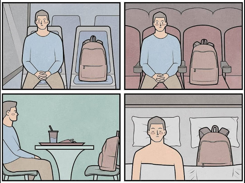 During the daytime, Kazakh artist and Moscow-resident Anton Gudim is an IT engineer. His daily office life observations form the basis for his comic strips, which he publishes on his social media accounts to over 1.3 million followers worldwide. Each strip starts with an everyday situation, and then turns it upside down with an absurd twist. Characterized by clean lines, bright colors and minimalist compositions, Gudim's use of visual metaphors and juxtapositions add an extra layer to his satire. Witty but subtle, it often takes a second look to see what is going on, or spot the social commentary that the cartoonist is actually giving.