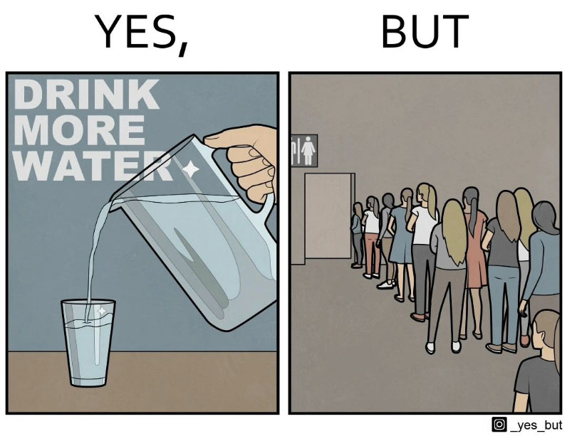 Since 2021, an important series in Gudim's output is his two-panel 'Yes... But...' cartoon. The first panel typically shows a seemingly ideal, successful or at least normal situation ("Yes..."), while the second one reveals the weird or cynical reality that lies beneath, or an inevitable result ("But..."). With these social commentaries, Gudim likes to challenge the reader to reflect on the funny contradictions in life, or engage in conversations on the social issues he addresses.