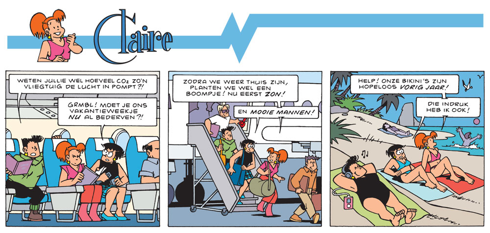 Around 2003, when Robert van der Kroft suffered from a muscle injury in his shoulder, he needed assistance for 'Claire', his gag comic written by Jan van Die and Evert Geradts. Since Guirado had managed to approach Van der Kroft's clear linework the best with the 'Sjors & Sjimmie' comics, he was asked to provide the finished artwork and inking. Guirado worked with Van der Kroft starting with the 16th album, all throughout the rest of the feature's run in Flair, a magazine for young women appearing in a Dutch and Flemish edition. The magazine's cancellation of the comic in March 2017 coincided with Carlo Guirado's retirement.