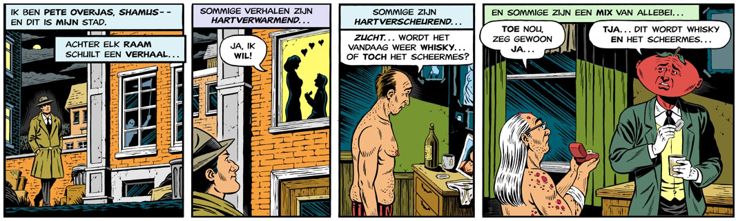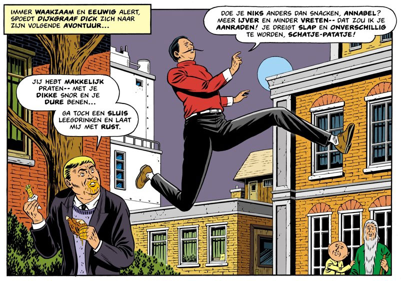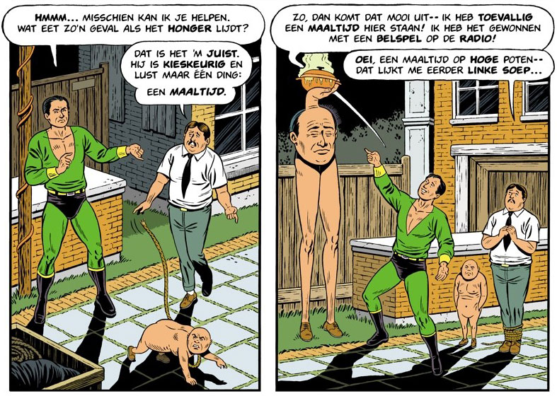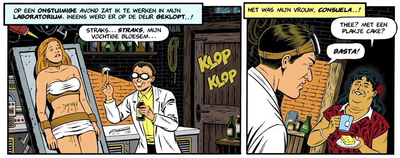 Narratively, Guthrie takes inspiration from early US horror comics, particularly those from EC Comics with their surprise twists. Guthrie's plots are however far more surreal and weird, comparable to the Flemish absurdism tradition. As an American, the cartoonist often takes inspiration from weird words in the Dutch language, for instance "dijkgraaf", the phrase for the chairman of a water board. This inspired the story of 'Dijkgraaf Dick', about an athletic man whose mustache can detect water leaks in the dikes. The man then drinks the leaking water, helping him grow to enormous proportions, although the sharp points of the water drops can sting his brain and cause headaches.
