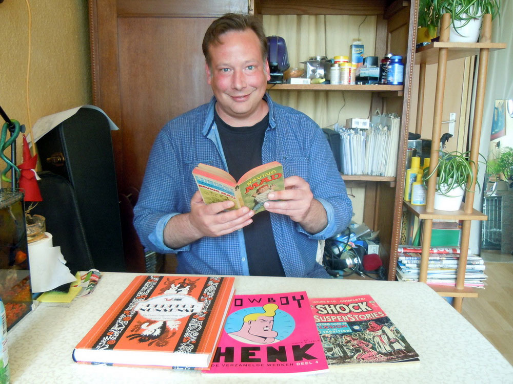 Charles Guthrie photographed in 2016 by Robin Schouten with a selection of his favorite comics. (Photo © Robin Schouten).