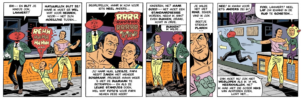 In addition to mainstream work, Guthrie has made his mark with his personal comic stories, characterized by offbeat characters, absurd humor and a retro graphical style. Outlets for these creations have been his own website/weblog and the cultural magazines Schokkend Nieuws (since 2011) and Zone 5300. Guthrie's characters - often created in collaboration with his wife - are either 1950s style well-coiffed women and pipe-smoking men, or creations with more distorted physiques. His signature character is Tomaat, a man (sometimes a woman) with a tomato head, whose gag strips have appeared online and in the magazines Vice and Schokkend Nieuws. Other creations are only heads with legs, or people with surreal character traits, varying from a man with a molten chin who infects the staff of a tie factory with his ailment to a murderous mop. Guthrie enjoys giving them remarkable names, such as Cardinal Casio, Pillowhead Klaas, Ginger Infinity and Homofoon Harry.