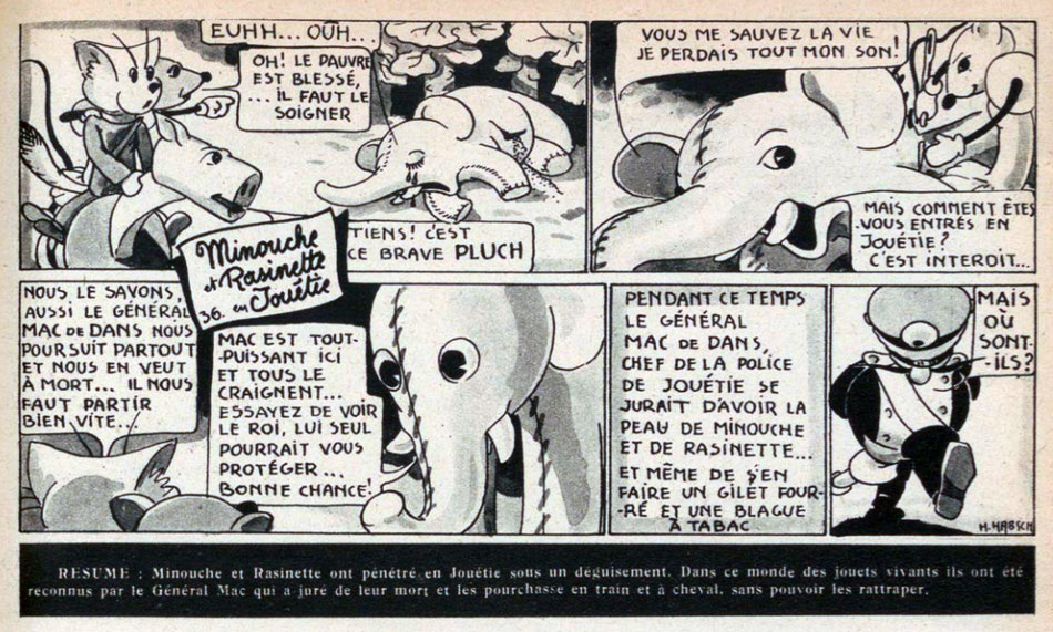 Starting in Grand Coeur issue #26 of 1946, Habsch created the serial 'Minouche et Rasinette en Jouetie', starring two mice who risk their lives every day by hopping from human kitchen to human kitchen. When they see marionnettes of Tchantchès (a local folklore character from Liège) and the toy soldiers of Charlemagne preparing for their return to Jouétie (Toyland), they decide to join them. However, when the General Mac de Dans refuses anyone without permission, the two mice have to try every trick they have up their sleeves. The story ran until the final issue of Grand Coeur on 27 February 1947, and has remained unfinished.