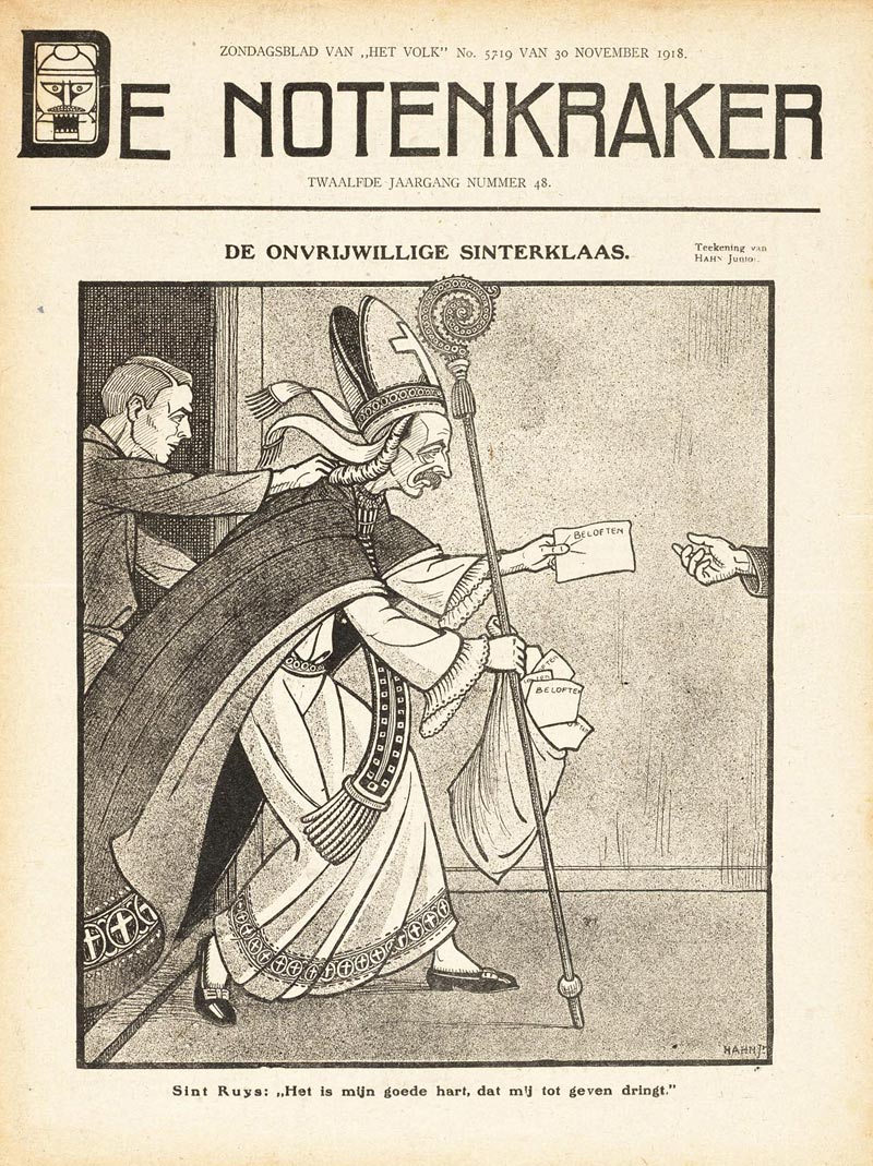 Cover illustration for De Notenkraker issue #48, 30 November 1918, depicting Dutch Prime Minister Charles Ruijs de Beerenbrouck as holiday character Sinterklaas, albeit a "reluctant one", as the caption reads. Ruijs is forced to keep all the political promises he made.