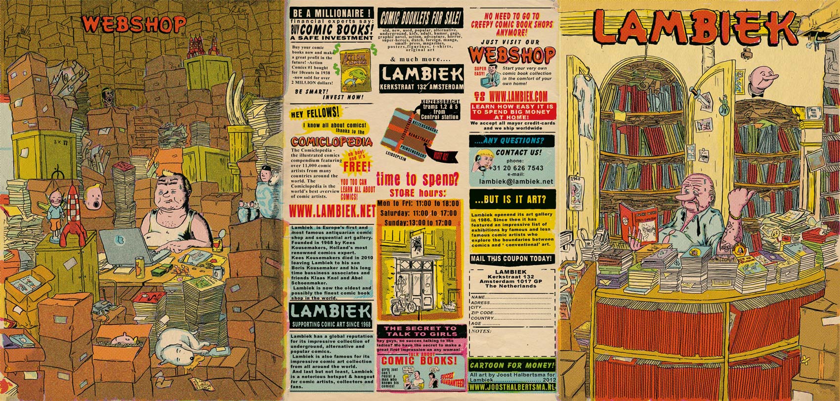 In addition to his daytime job, Halbertsma has been working on his own art projects in different types of media, including objects, posters, animated movies and photographs. However, drawing has remained the backbone of his work, with his art and sketches appearing in self-published "crapbooks", such as 'The Lost Pages' (2005), 'The Bitter, The Better' (2008) and 'Focus on the Future... Try Not To Panic' (2009). In addition to his personal projects, Halbertsman has done commission work. A notable project in 2012 was the new flyer for comic book shop Lambiek in Amsterdam, which coincided with the launch of the store's webshop. It was a good showcase of Halbertsma's underground style, and a wonderful overview of the store and gallery at the Kerkstraat 132 location, with several subversive cameos of comic book characters.