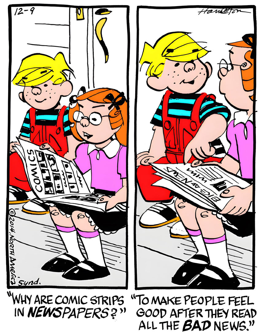 Since 1995, Marcus Hamilton has drawn over 7,000 'Dennis' cartoons, which are distributed by King Features Syndicate to about 1,000 newspapers worldwide. Even though Dennis celebrated his 70th anniversary on 12 March 2021, he is still the same mischievous "five-ana-half" year old kid in red overalls with blond hair and a cowlick. True to Ketcham's original, the havoc Dennis causes is still unintentional, and the cast of characters has remained the same. Interviewed in June 2019 by the local Charlotte magazine from Charlotte, North Carolina, Hamilton revealed the most important advice Hank Ketcham gave him: "I want you to have fun drawing Dennis, because if you're having fun, it will show in your work." With that in mind, Marcus Hamilton has continued to draw Dennis from his Mint Hill house studio well into his seventies.