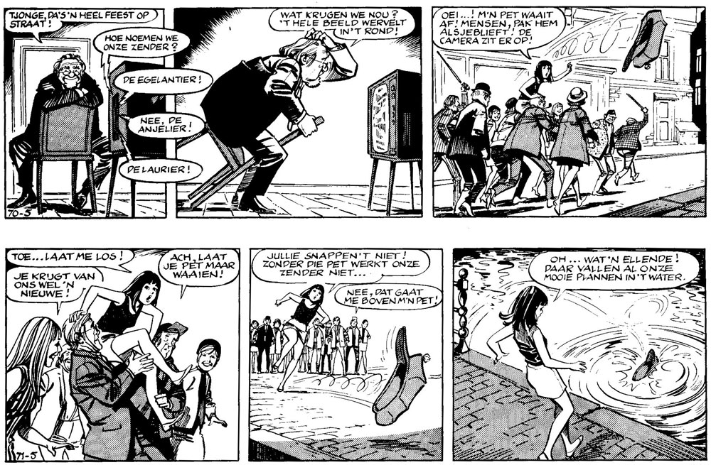 Even though by now Rab Hamilton stories have been identified in British girls' magazines well into the 1980s, the artist largely disappeared off the radar in 1973. In the previous year, an artist by the name of Robert Hamilton had made his debut on the Dutch comic market as the second illustrator of the Amsterdam adventures of the cheeky Aafje Anders, with her out-of-the-box solutions and recalcitrant nature. 'Aafje Anders' was a production of the Marten Toonder Studios, at the time the main supplier of Dutch newspaper comics, developed by staff writer Andries Brandt for newspaper De Telegraaf. Hamilton took over midway the fifth story, when the original artist Jan van Haasteren quit. Hamilton was suggested to Brandt by Marten Toonder himself, the studio's former patron who at the time resided in Ireland. According to an interview in a 1985 'Aafje Anders' book collection, Hamilton brought the comic exactly the right style and atmosphere Brandt envisioned. Still, Brandt couldn't afford Hamilton for the full job, so the Brit only penciled and inked the characters and gave rough outlines for the backgrounds. To save costs, the finished background art was done by Toonder staffer Richard Klokkers.