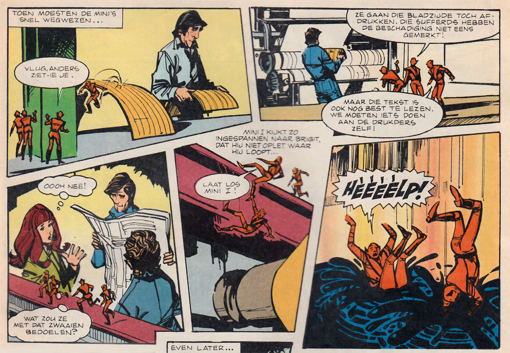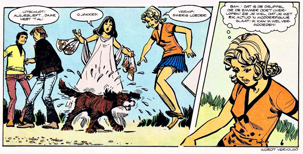 However, 'Aafje Anders' was not a success. Every attempt to sell the strip on the British market failed. The feature came to an end after ten stories - six of which drawn by Hamilton and Klokkers - on 17 April 1973. In that same year, the Toonder Studio's shut down their comic strip department. Andries Brandt became a prominent freelance scriptwriter for the girls' magazine Tina - originally a translated edition of the British Princess Tina, but since the early 1970s thriving on a fruitful local production. In 1974, Hamilton renewed his association with Brandt at Tina magazine, making three 44-page serials about the everyday adventures of 'Kitty' (1974-1975). Robert Hamilton was also supposed to take over drawing Tina's title comic, 'Tina en Debbie', written by Brandt and drawn by Purita Campos. For unknown reasons, it never happened, as Campos continued to draw the serial until well into the 21st century. Some stories with Tina and Debbie drawn by Rab Hamilton however appeared in Tina's seasonal anthology books. In 1977, Hamilton drew another serial for Tina, 'Brigit en de Mini's', about a girl who has to hide a group of mini aliens that landed their mini spaceship in her bedroom.