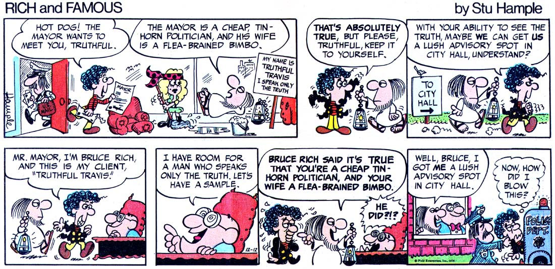 Only one month after the launch of 'Inside Woody Allen', Stuart Hample started an additional comic strip: 'Rich and Famous' (1976-1977). It went into circulation through Field Enterprises on 1 November 1976. It centers around talent scout Bruce Rich, his long-suffering wife Daphne and the various wannabe entertainers that they have to endure. The comic strip made Hample neither rich or famous and came to an end after five months, on 12 March 1977.