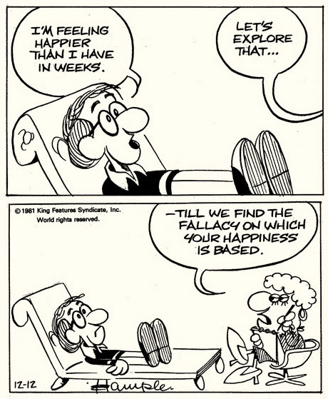 Syndicated by King Features, the first episode of 'Inside Woody Allen' appeared in newspapers on 4 October 1976. Since Hample's other comic strip, 'Rich and Famous', debuted at a rival syndicate one month later, early episodes of 'Inside Woody Allen' appeared under the pseudonym Joe Marthen, a contraction of the names of Hample's children Joe, Martha and Henry. After 19 September 1977, when 'Rich and Famous' was discontinued, 'Inside Woody Allen' ran under Hample's real name. In the earliest episodes, Hample drew Allen with a small nose, but he later gave him a larger, more bulbous nasal organ. The comic strip portrays the comedian according to his public image: a neurotic New York intellectual who struggles with existential problems. His parents induce him with guilt, his relationships are rarely satisfying and he frequently visits psychiatrists. However, other gags portray Allen more like the real-life celebrity. We see him appear in talk shows, deal with obnoxious fans or argue with his slick agent Bernie. Other side characters are his bearded psychologist dr. Hrolf Helmoltz and cynical female therapist Dr. Fobik.