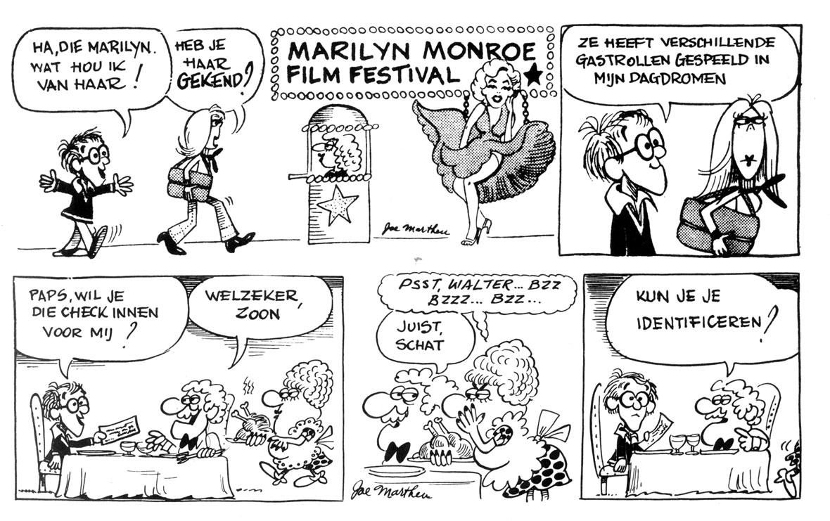 Dutch translation of 'Inside Woody Allen'. Allen: "Ha, that Marilyn. Oh, how I love her!" Woman: "Did you KNOW her?" Woody: "She played various guest roles in my daydreams." Allen: "Dad, can you cash this cheque for me?" Father: "Sure, son." Mother: "Psst, Walter... Bzz Bzzz Bzz". Dad: "Right, dear. Can you identify yourself?"