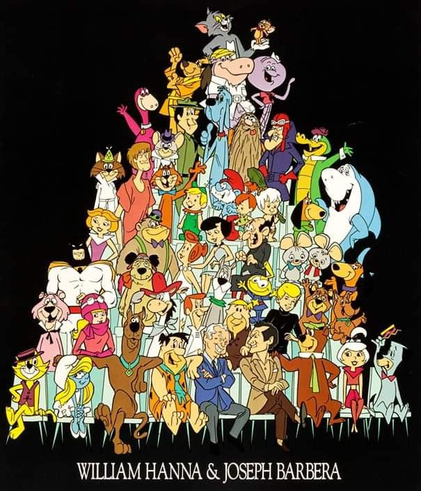 William Hanna and Joseph Barbera with their characters. On top: Tom & Jerry. Second row: Hong Kong Phooey, Peter Potamus, Squiddly Diddly. Third row: Dino, Blabber, Ranger Smith, Foofur, Captain Caveman, Dick Dastardly, Wally Gator. Fourth row: Snooper, Shaggy, Mr. Jinks, Elroy Jetson, Big Papa Smurf, Pebbles, Bamm-Bamm, Augie Doggie, Jabberjaw. Fifth row: Jane Jetson, Magilla Gorilla, Wilma Flintstone, Betty Rubble, Gargamel, Pixie & Dixie. Sixth row: Space Ghost, Muttley, Astro the Dog, Allstar the Snork, Boo-Boo, Scrappy, Doggie Daddy. Seventh row: Snagglepuss, Penelope Pitstop, Quick Draw McGraw, George Jetson, Barney Rubble, Jonny Quest. Final row: Top Cat, Smurfette, Scooby-Doo, Fred Flintstone, William Hanna, Joseph Barbera, Yogi Bear, Judy Jetson and Huckleberry Hound.