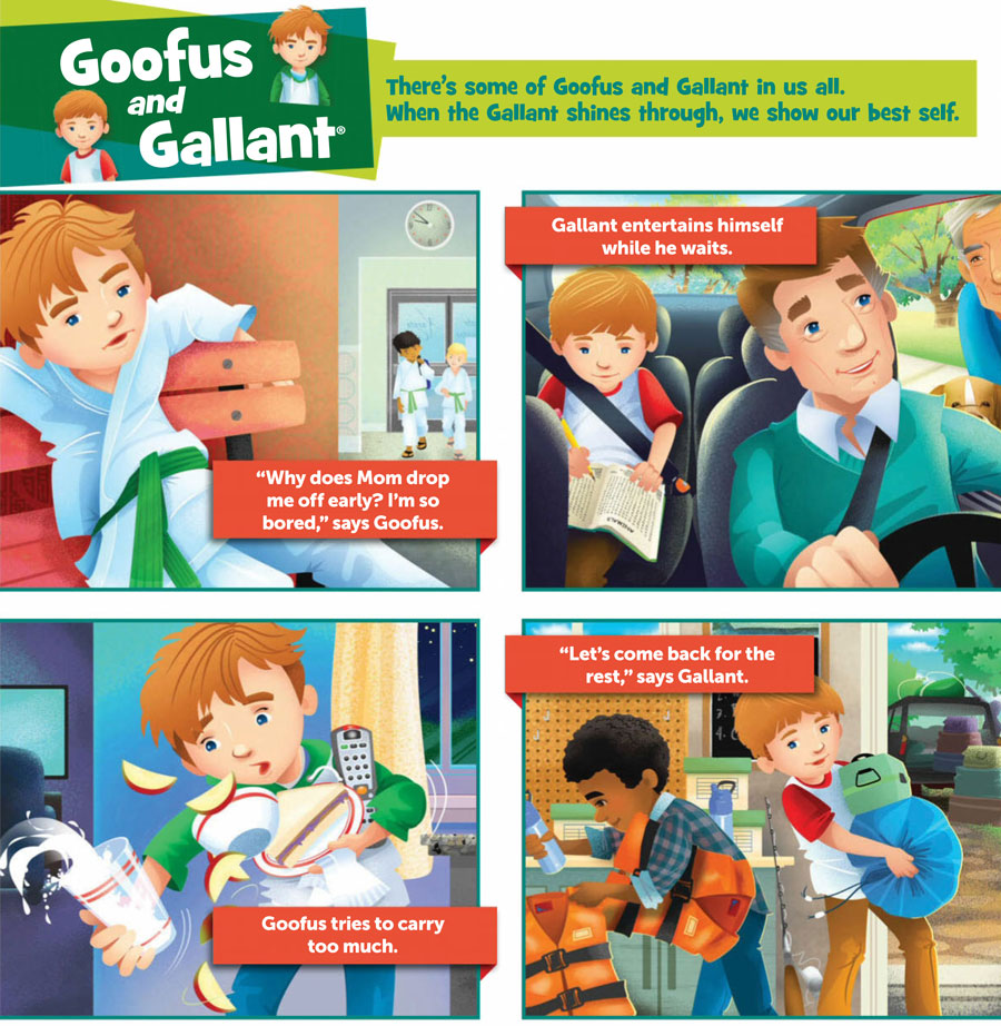 Since January 2006, one of Harrington's major assignments is the series 'Goofus and Gallant'  for the monthly magazine Highlights for Children. It is one of the longest-running comics features in an American magazine, created in 1938 by Garry Cleveland Myers, while Maurieta Wellman, Marion Hull Hammel, Sidney A. Quinn, Kit Wray and Anni Matsick have served as its previous illustrators. The moralistic picture stories teach children good manners by presenting on one side a mischievous child engaging in unacceptable behavior (Goofus), and on the other side a model child (Gallant) showing how it should be done. Whereas her predecessor Matsick was the first to draw the series in color, Harrington transferred it into the digital age. Nowadays, she works completely paperless, creating her episodes with a Wacom, Photoshop and Click Studio Paint. She originally drew the characters rather cartoony, but by the mid-2010s the series got a simpler and more decorative new look, with shapes and textures.