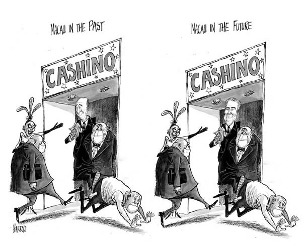 Cartoon by Harry Harrison, depicting how nothing changes in Macau's casino-driven economy, except for the people running the business.