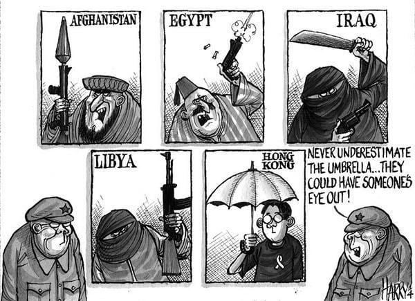 In 1997, the same year the United Kingdom returned Hong Kong to China, Harrison drew his first cover cartoon for The South China Morning Post. Since 2001, his political cartoons have appeared six times a week in this newspaper, under the title 'Harry's View'. Since Hong Kong had been a British dominion, the city is different from the rest of mainland China, which is under Communist influence. Hong Kong is basically a huge city run like a town. Local politicians do listen to the Chinese government during crucial matters, but otherwise Harrison described the Hong Kong political climate as a "non-political scene", adding: "I'm pro-democracy, but I find the democracy movement here quite disappointing, so I'm not averse to having a go at it. The only platform the democrats have is democracy. After that they don't have anything else – any policies."