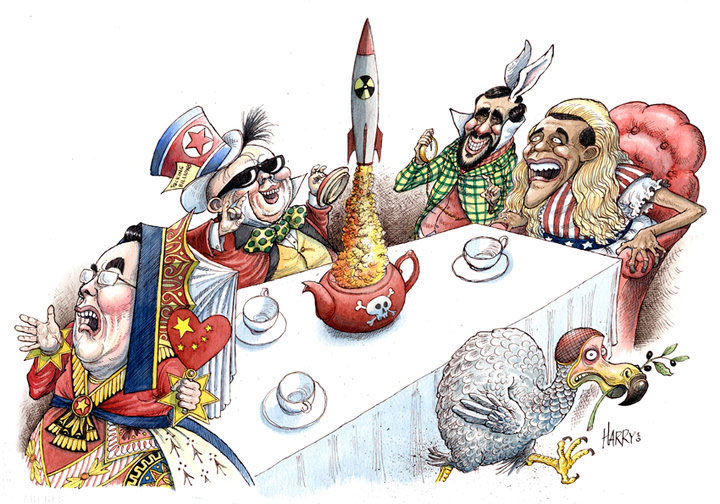 2010 cartoon by Harry Harrison, commenting on North Korea's launch of a nuclear missile, with the artwork parodying 'Alice in Wonderland'. President of the Hong Kong Legislative Council Andrew Leung is the Red Queen. North Korean dictator Kim Jong-Il is the Mad Hatter, Iranian Prime Minister Mahmoud Ahmadinejad the March Hare and U.S. President Barack Obama Alice. The Dodo is cast in the role of peace dove.