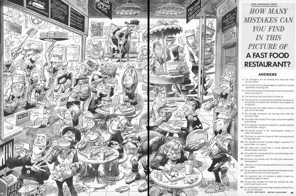 Hart's best known work for Mad is the 'How Many Mistakes Can You Find In This Picture?' series, which debuted in issue #226 (October 1981) with an episode set during a rock concert, drawn by Woodbridge again. Other episodes would be set in a disco club (issue #227, December 1981), video game center (issue #233, September 1982, drawn by Mort Drucker), stereo/music store (issue #236, January 1983, again drawn by Drucker), school prom (issue #240, July 1983, drawn by Angelo Torres), fast food restaurant (issue #246, April 1984, drawn by Jack Davis) and film theater (issue #249, September 1984, also drawn by Davis). A typical episode featured a detailed two-page illustration with numbers added to several individual scenes. The numbers would be summarized in a caption on the side of the page, complete with an explanation of the "mistake". Each drawing was a romanticized depiction of a certain location, while the commentary sarcastically pointed out how things would be in real life. In the rock concert drawing, for instance, nobody is leaving a mess behind, the musicians aren't playing to a backing track and one spectator is leaving early because he wants to be fit for school the next day… For other Mad articles, Hart also collaborated with Al Jaffee, Paul Coker, Rick Tulka, Bob Jones, Sam Viviano, Hermann Mejia and Bill Wray.