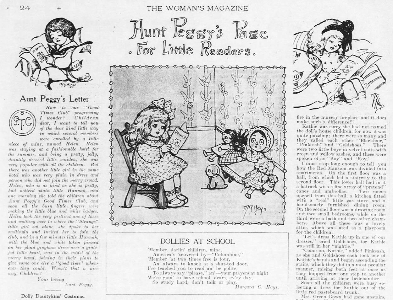 Margaret Parker Gebbie was born in 1874 in Philadelphia as the daughter of an art publisher. As a child she was homeschooled by governesses, after which she went to the Convent of Notre Dame boarding school in Philadelphia (today the Academy of Notre Dame de Namur). In 1893 she married architect Frank Allison Hays. She made paper dolls for postcards and created the Sunday comic strip 'Jennie and Jack, also the Little Dog Jap' (March-August 1908) for the Boston Herald, about a brother and sister whose good intentions always lead to dire results. The comic was also syndicated to other papers. Between 1908 and 1913, Margaret Gebbie Hays additionally made stories and illustrations for women's and children's pages, syndicated to American newspapers.
