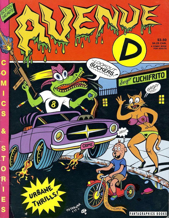 Head further (co-)edited three issues of the comic anthology 'Snake Eyes' with Kaz, and the pulp-crime underground comix anthology 'Hotwire Comix & Capers'. Stories by Glenn Head have appeared in a wide variety of publications from The Wall Street Journal to Screw, and his drawings have also appeared in The New York Times, Playboy, New Republic, Sports Illustrated, Pulse Magazine, Advertising Age, Interview, Entertainment Weekly, and Nickelodeon Magazine.