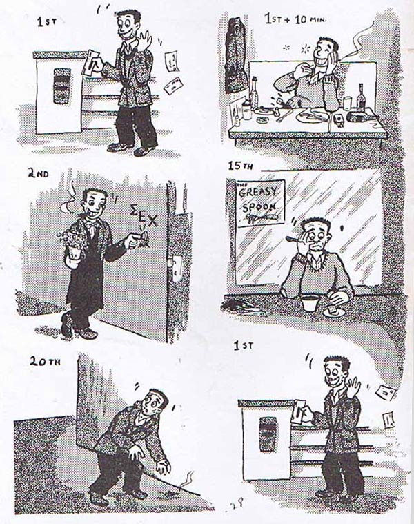 Between September 1977 and December 1984, a special section ran in Playboy, titled 'Playboy Funnies'. Presented in the style of a newspaper comic section, 'Playboy Funnies' offered several gag comics, spread over two to four pages. The initiative was launched by underground comix artist Skip Williamson, who had two long-running features in its pages. The first, 'Neon Vincent's Massage Parlor', featured a man who claimed to run a massage parlor, which in reality was obviously a brothel. It debuted in September 1977 and ran on irregular intervals until February 1984. His second feature, 'Nu-Wave Romance with Nell 'n' Void', debuted in November 1980 and revolved around a woman and her sex life. Williamson also invited several of his underground colleagues over to contribute comics. Jay Lynch had a two-panel gag comic, 'Give 'Em An Inch', which ran from September 1977 up until the May 1982 issue. The comedy revolved around hypocritical or ironic situations regarding sexual behavior. In November 1978, Bobby London's 'Dirty Duck', which previously ran in Playboy's regular pages, was moved to the 'Playboy Funnies' section. London also scripted the one-shot comic 'Bound for Love', drawn by Ralph Reese, which appeared in the September 1977 issue. Jay Kinney also made an one-shot comic, 'Unbad Kisses' , for the November 1978 issue. Art Spiegelman drew several one-shot stories for Playboy Funnies, one in collaboration with Steve Miller ('Facts of Life', March 1979). Spiegelman's signature series was 'Ed Head', about a man who was just a walking and talking head. It could be enjoyed from the December 1978 issue until November 1981.