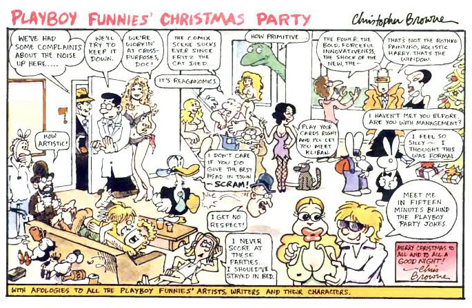 Several characters from the Playboy Funnies in a 1982 Christmas cartoon crossover panel by Chris Browne. At the door, we notice the sexuologist from Browne's 'The Kinky Report', with Frank Thorne's Moonshine McJugs standing behind him. In the lower left corner, Browne's painters Van Gogh and Born Toulouse can be spotted. On the sofa, Betsy from Harvey Kurtzman and Sarah Downs' 'Betsy's Buddies' is making out with her partner. Guarnaccia's Buggery is drinking behind the sofa. Frank Baginski & Reynolds Dodson's The Loner complains that he never scores. Bobby London's Dirty Duck kicks Art Spiegelman's Ed Head away. On the stairs, we spot J. Michael Leonard's Annie & Albert, alongside Paw from Fred Schrier's 'Meaty Myths'. Next to him are Al Farnum's Suzy Q. and Midnite the cat, with John Stevens' Tyrannosaurus Sex and his cavewoman partner closeby. John Delmar's Holistic Harry thinks he's looking at a painting, but Skip Williamson's Nell 'n' Void point out it's a window. The rabbit from Randall Enos' 'Reg'lar Rabbit' talks with the Playboy Bunny mascot. In the right corner below, the prostitute from Skip Williamson's 'Neon Vincent's Massage Parlor' is groped by Chris Browne's Cruiser. The only characters not associated with Playboy Funnies are Chester Gould's Dick Tracy at the door and George Herriman's Ignatz the Mouse behind the sofa.