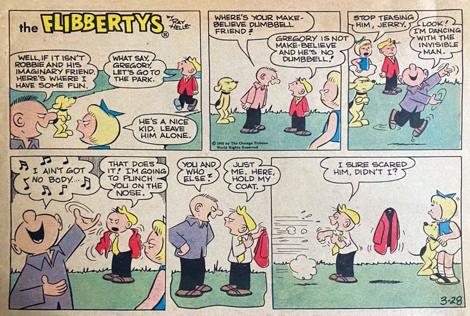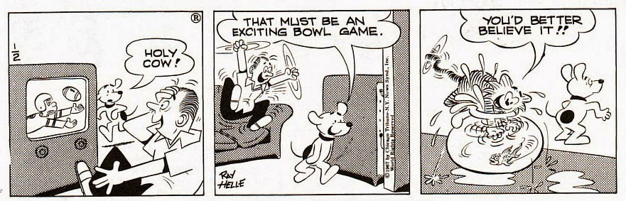 After years of doing gag cartoons, Helle created his daily family comic 'The Flibbertys' (1954-1972). First printed on 20 September 1954, the feature revolved around a young couple, Stan and Fran Flibberty, and their three children, teenager Wendy and younger kids Butch and Sis. However, their anthropomorphic pets, Geddown the Dog and Preston the Cat, quickly stole the spotlight. The animals often argue with each other, while their dialogues cannot be heard by the humans. One of the comic's running gags was that Preston always tries to catch a mouse, who outsmarts him at every opportunity. In later decades, Helle focused more on the pets than the humans. 'The Flibbertys' ran in The Evening Independent and was for 18 years syndicated by The Chicago Tribune-New York News Syndicate. For the creation of his comic, Helle took a lot of inspiration from his own family life and pets. On 20 August 1972, the final episode appeared in the papers.