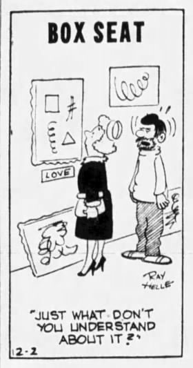 Also for the Chicago Tribune-New York News Syndicate, Helle created the daily one-panel cartoon series 'Box Seat' (1964-1966), which poked fun at theater, film and television. He subsequently left his syndicate and became a freelance cartoonist and self-syndicated his new creations. While assisting on publications for the Presbyterian church, where he served as deacon, he came up with the idea of 'Bible/Crostics', a biblically-themed crossword puzzle feature. Self-syndicated to mostly Florida newspapers during the 1970s, the feature was also published in booklet form.