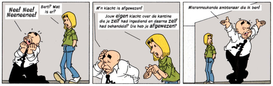 Also for Eppo magazine, Hercules created the gag strip '40 Hours' (2010-2017), drawn by Dick Heins. The comic stars three office workers - young Mark, lazy Bert and their head of service, Jensen - and ran for seven years, presenting recognizable everyday office humor. By 2017, Hercules and Heins ended their series by having Mark marry Jensen. The series returned in Eppo's pages in 2020, but then under the title '24 Hours'. Now a part-timer, Bert is transferred to a new office space, with new colleagues.