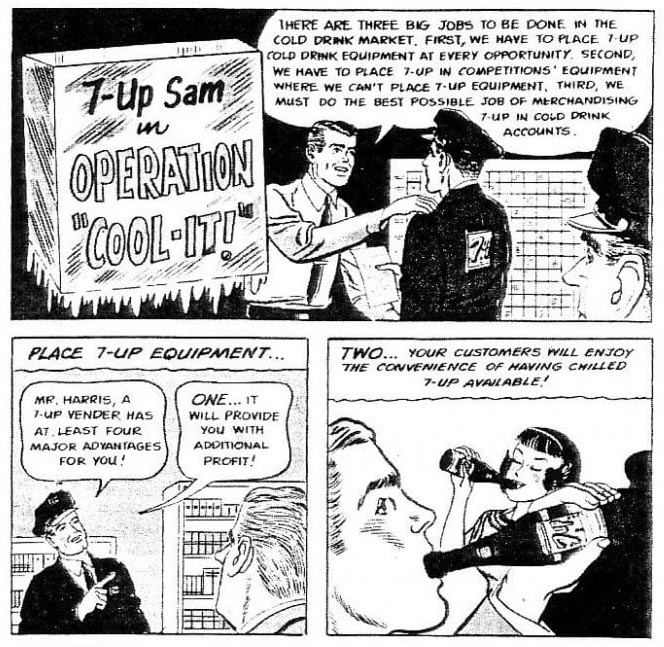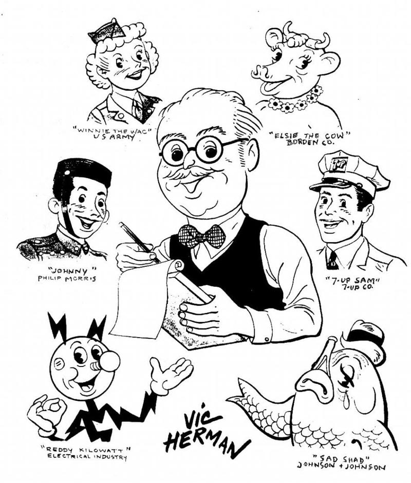 After returning to civilian life, Herman worked as a staff illustrator and correspondent for Hearst Features. William Randolph Hearst asked him to illustrate Bob Considine's newspaper column. Mell Lazarus once worked in Herman's studio for six months. After he left, he found a job as art director at Toby Press, where he hired Herman as a contributing comic artist. By 1948, Herman had enough assignments to establish his own art advertising company, Vic Herman Productions. Over the decades he worked for many companies, creating advertising characters like 'Johnny' for Philip Morris, '7-Up Sam' for 7-Up,  'Reddy Kilowatt' for the Electrical Industry, and 'Sad Shad' for Johnson & Johnson. Most of these characters were also used in advertising comics, often drawn by Herman personally.