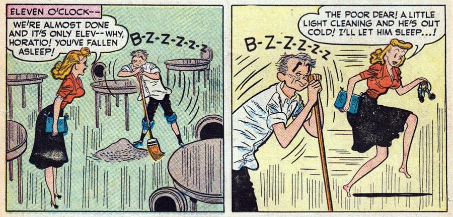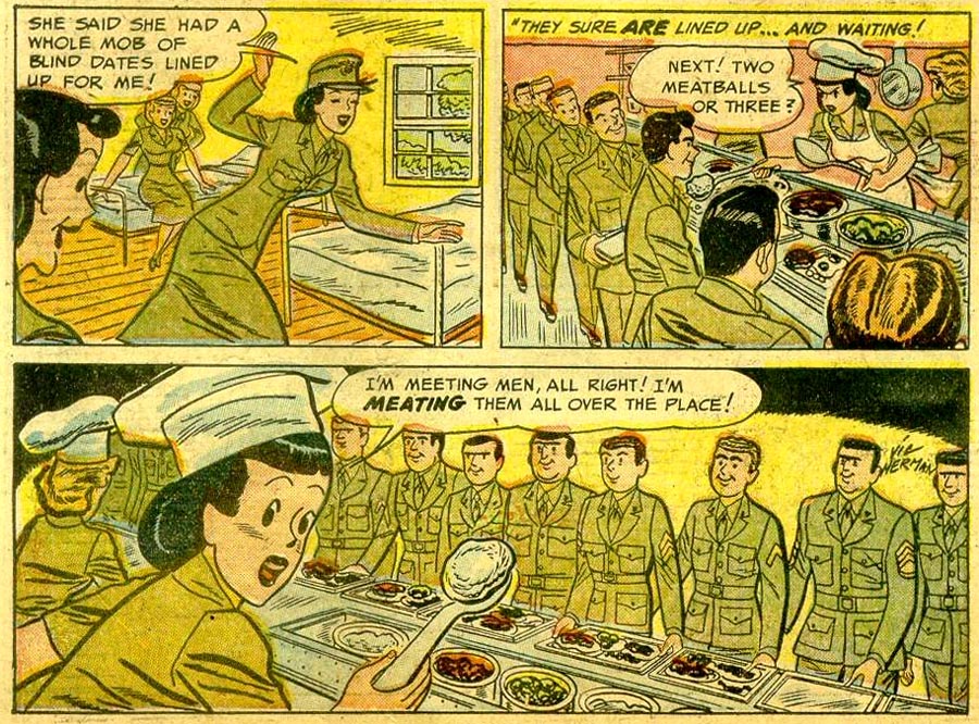 Herman also worked as a comic artist for Harvey Comics (1948-1960), Parents' Magazine Press (1947-1949) and Toby Press (1949-1955). 'Winnie the WAC' cartoons had already appeared in Harvey's "gals and gags" title 'Hello Buddies' (1944-1945), which aimed at servicemen. By the end of the decade, he moved on to drawing filler comic stories in several other Harvey comic books. Most of them were about 'Winnie the Waitress' (1948), who appeared in Fun Parade, First Love Illustrated, Black Cat and other titles. The character was basically 'Winnie the WAC' again, but in a civilian setting.